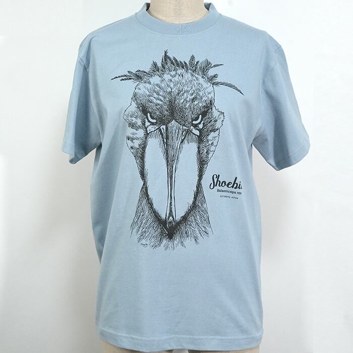 ハシビロコウモチーフの線画イラストTシャツです。ハシビロコウの羽色を彷彿させる色アシュレイブルー色。ジャケットを羽織りチラッと見える目力に釘付けです。