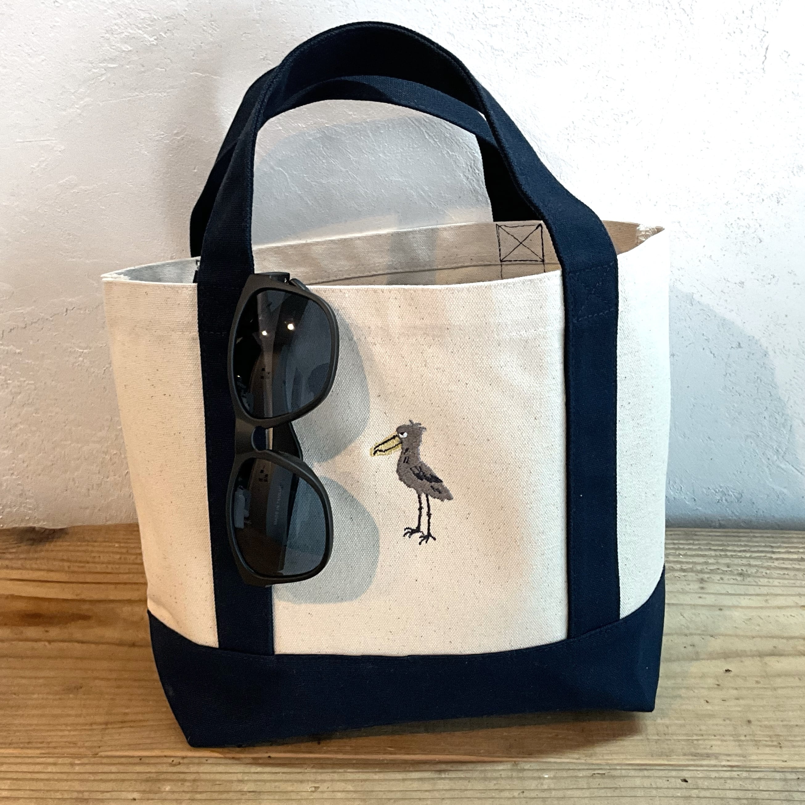 横向きで目力のあるユニークなハシビロコウの刺繍ランチトートバッグ。大きさはランチボックスやお弁当、ドリンクボトルがすっぽり収まるサイズ感。外ポケットにはスマホなどすぐに取り出して使いたいものを入れらます。素材はしっかりとしたキャンバス生地で耐久性にも優れたバッグです。