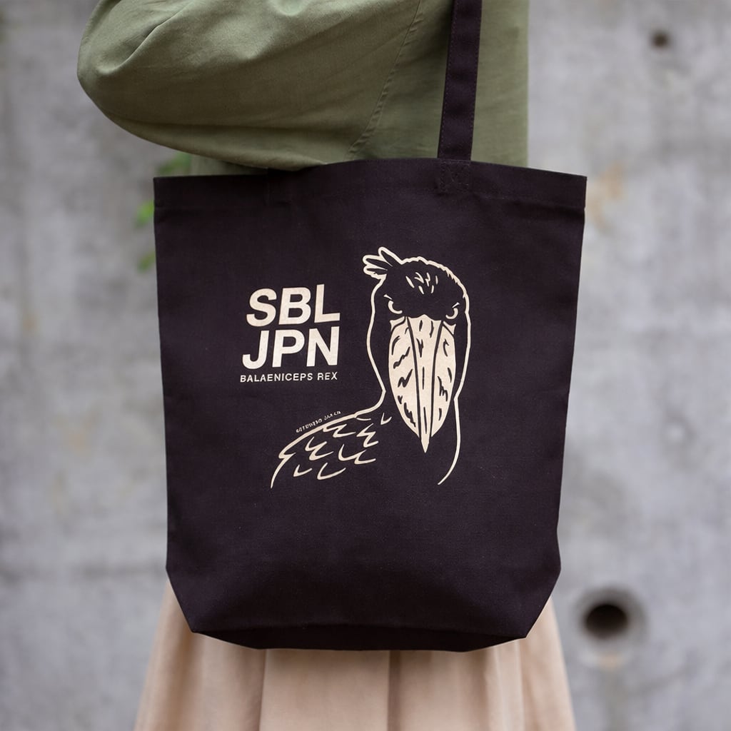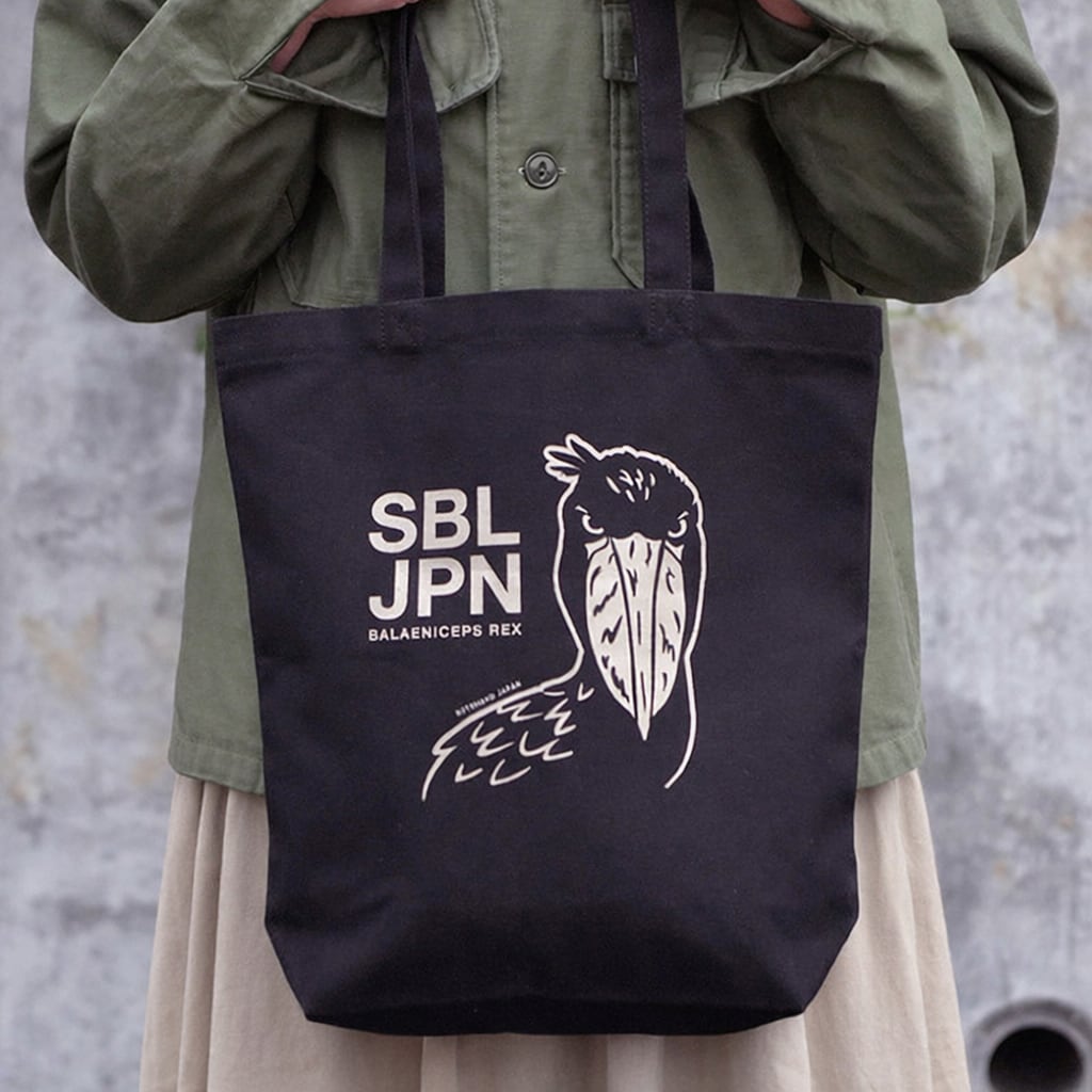 SBL JPNのハシビロコウブラックトートバッグ。 マチ付きで収納力があり、荷物をたっぷり入れられます。 手持ちでも肩掛けでも使いやすいデザイン。 しっかりとしたキャンバス生地で、日常使いにも安心です。