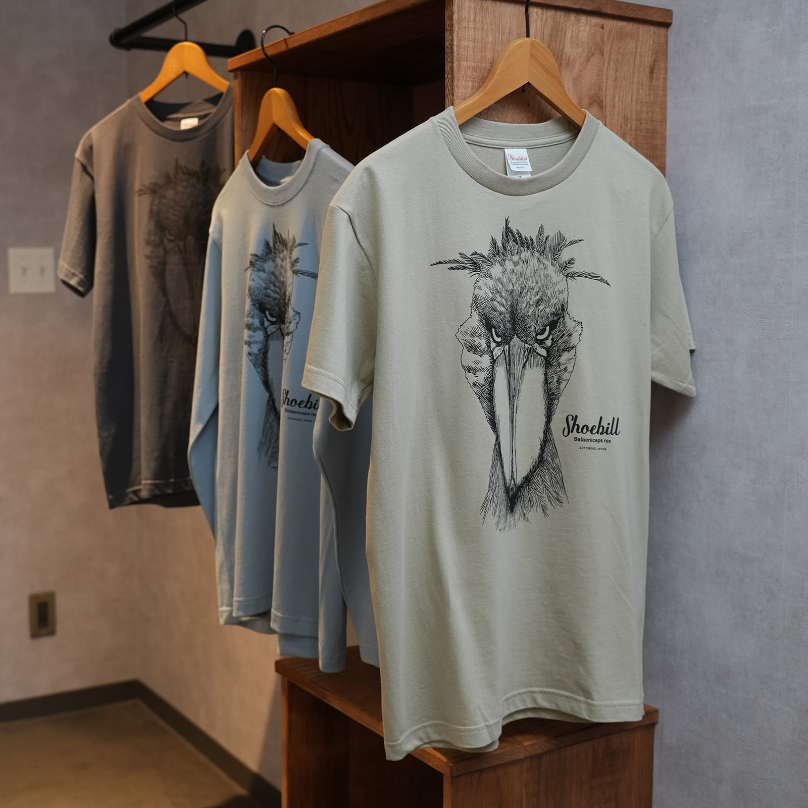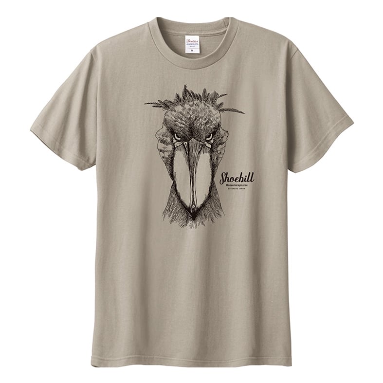 ハシビロコウモチーフの線画イラストTシャツです。くすみカラーのシャツ素材を選んでいるのでさりげなくおしゃれに着こなせます。ジャケットを羽織りチラッと見える目力に釘付けです。