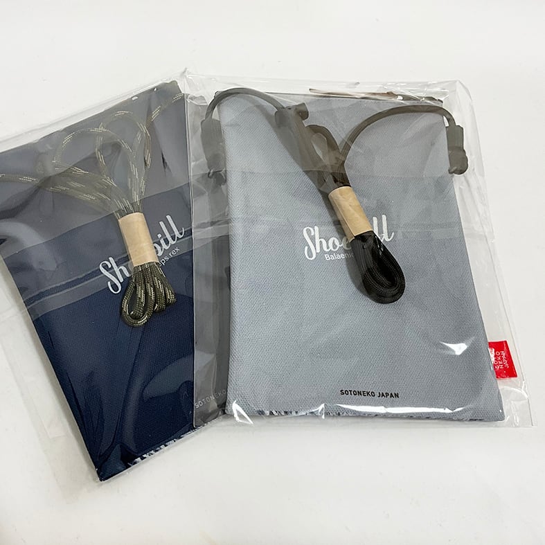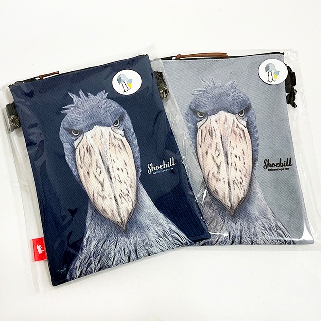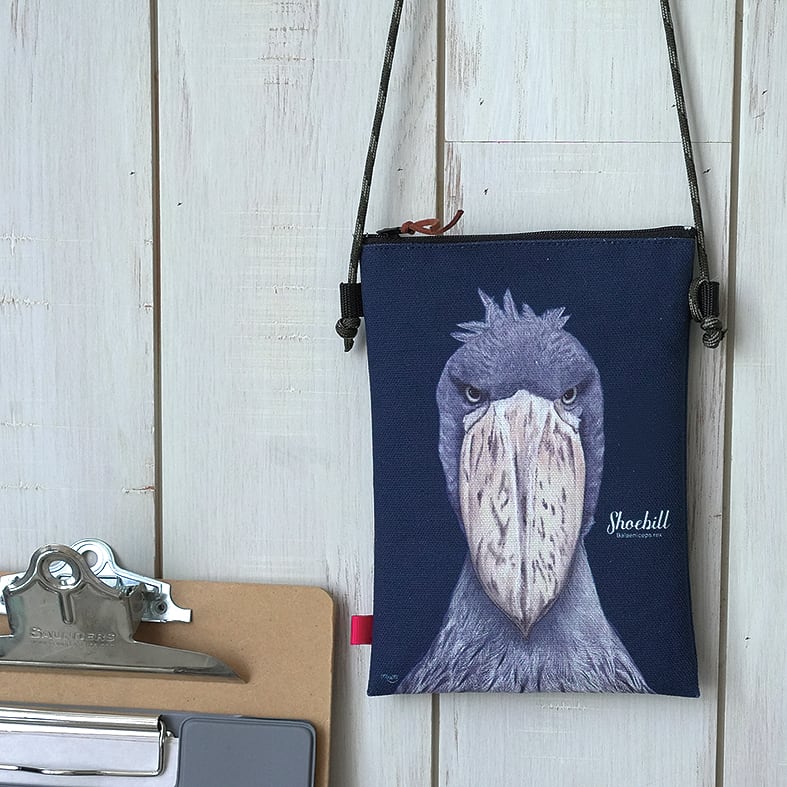 ハシビロコウの正面顔イラストポシェット。丈夫なキャンバス生地を使用し、内側はラミネート加工で汚れにくい仕様です。スマホケースとしても使え、上部ジッパーで開閉。紐は約140cm、長さ調節ストッパー付き。