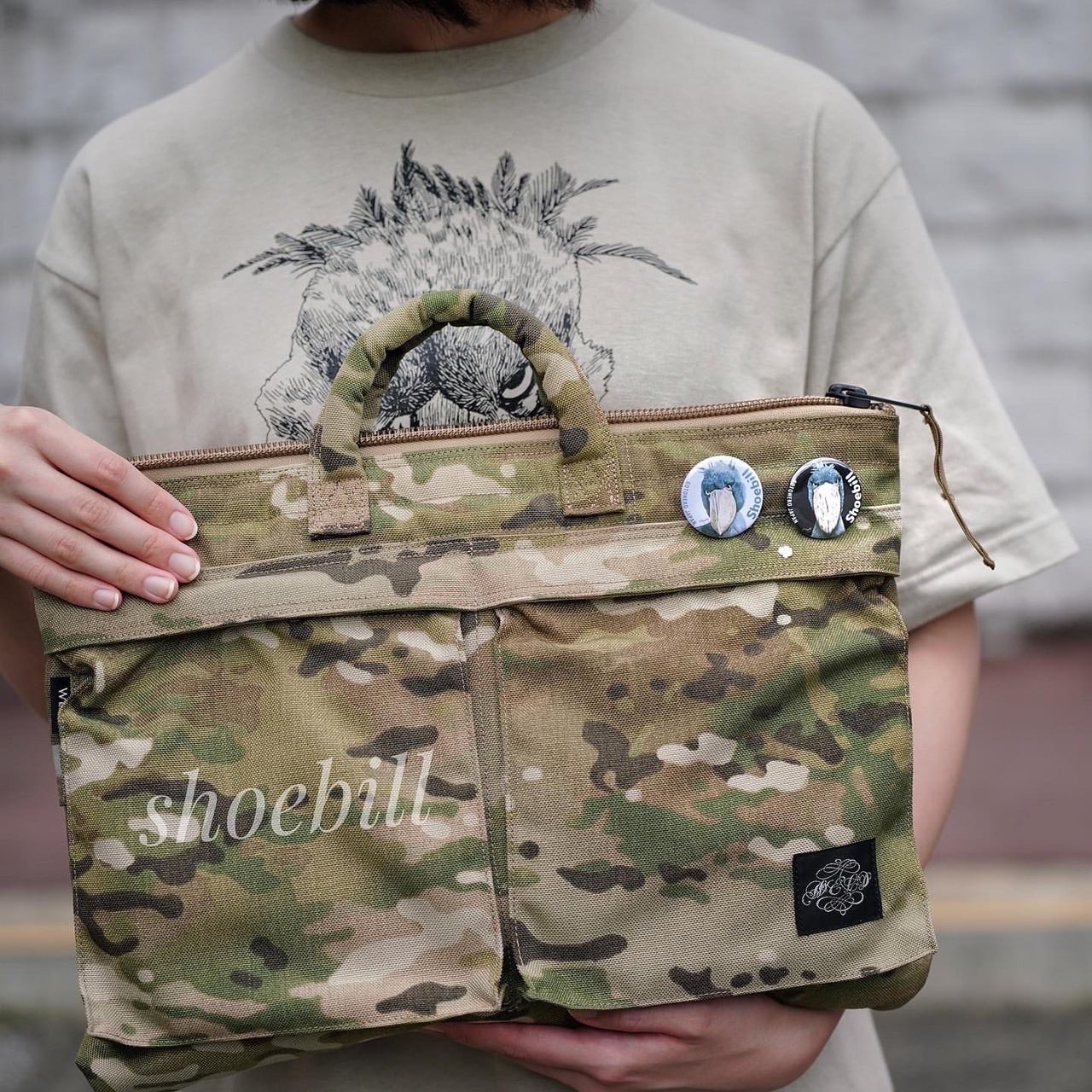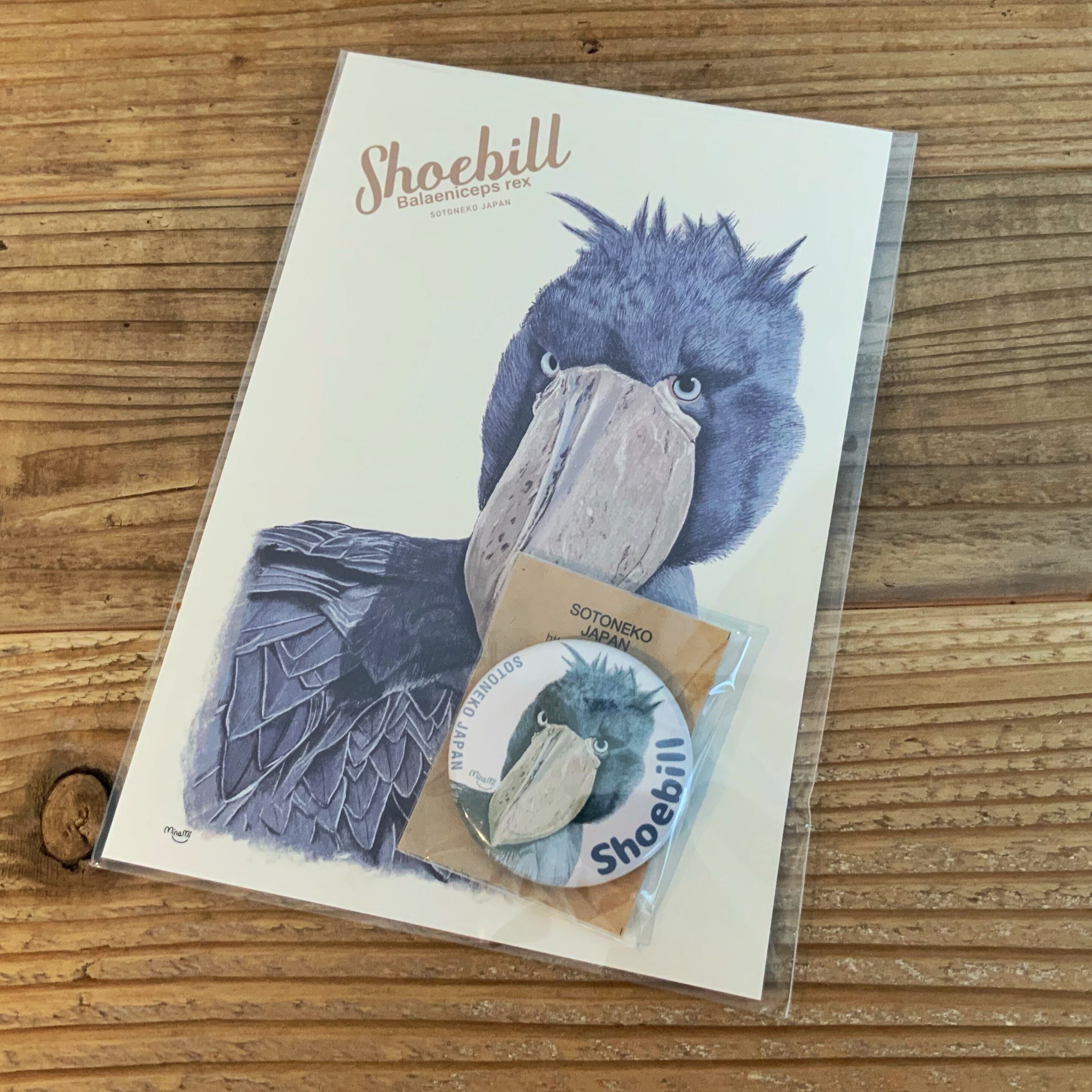 かわいいハシビロコウのイラスト缶バッジとポストカードのセット。缶バッジは直径38mm 安全ピンタイプ。