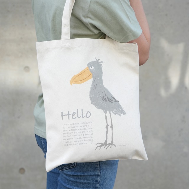 ハシビロコウのイラストのトートバッグが登場。マチ付きなのでたっぷり収納できます。手持ちでも肩にかけても便利です。素材はしっかりとしたキャンバス生地で、耐久性にも優れたこのトートバッグは日常使いにおすすめ。