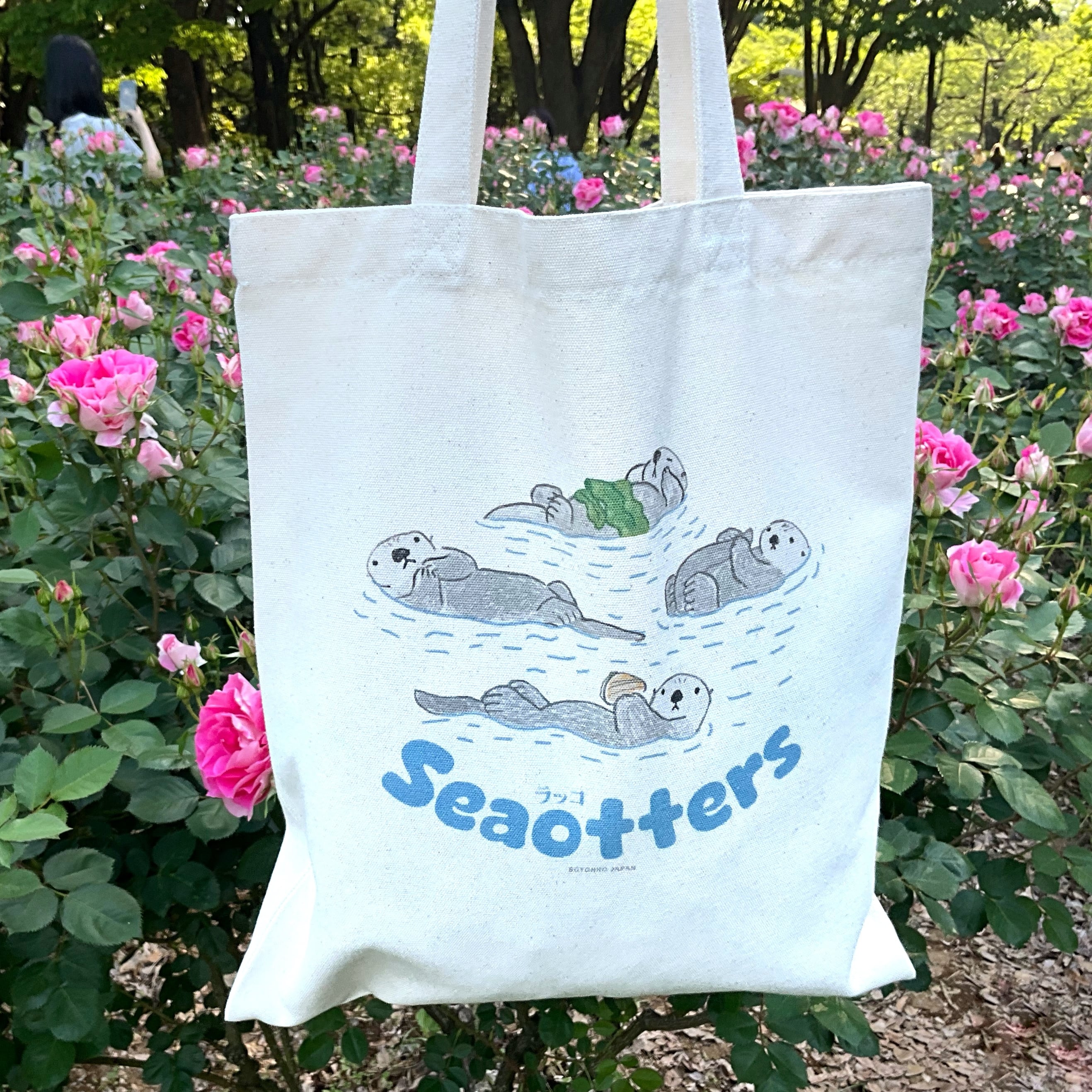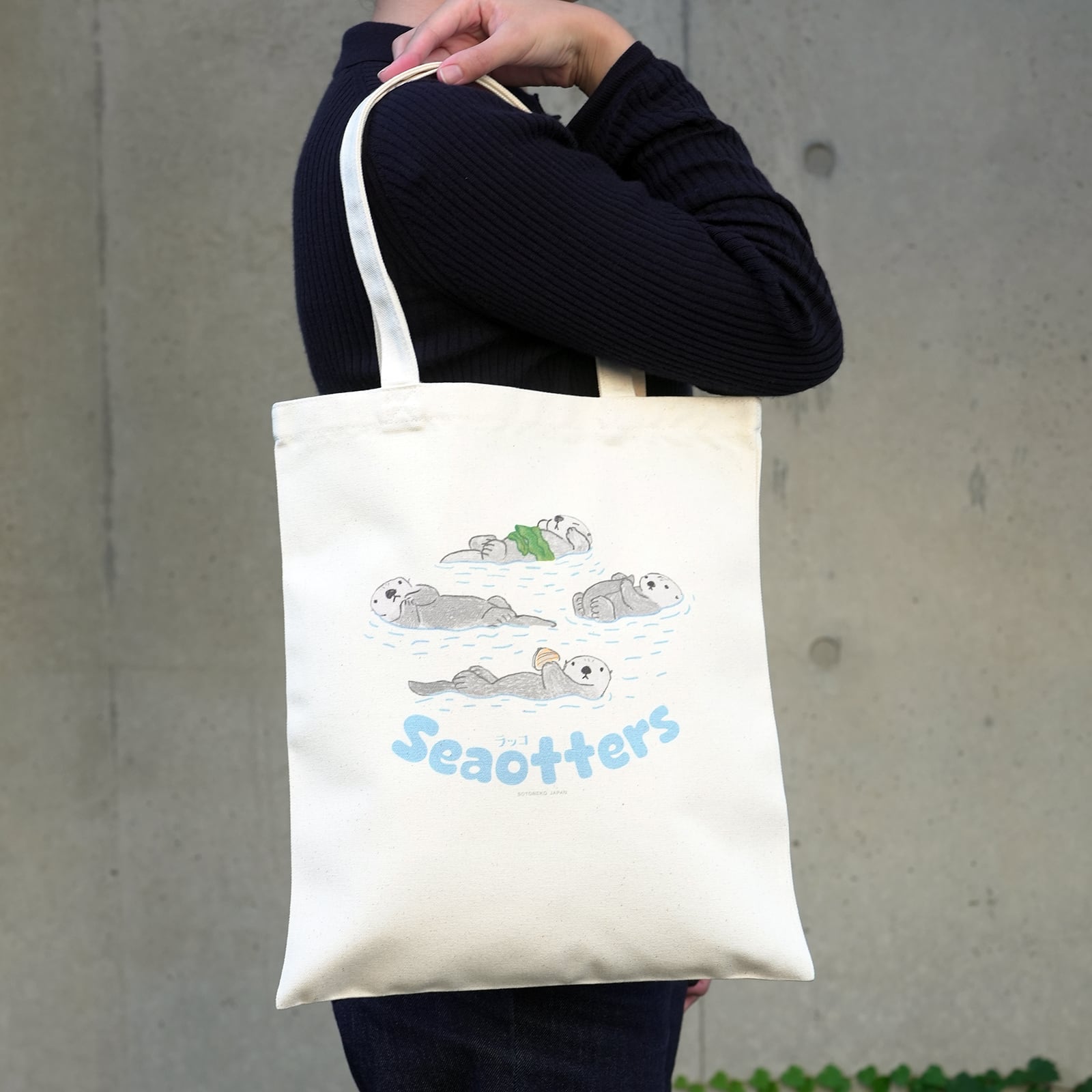 ラッコファミリートートバッグは、愛らしいラッコたちが描かれたA3サイズのトートバッグです。浮かぶ4頭のラッコたちがそれぞれの仕草で活き活きと描かれており、見ているだけで和ませてくれるかわいさが魅力です。大きめのサイズでたっぷりと収納できるので、お買い物やお出かけ時に便利にご利用いただけます。 写真はフラットですがマチ付きに仕様変更しました。寸法図をご覧ください。