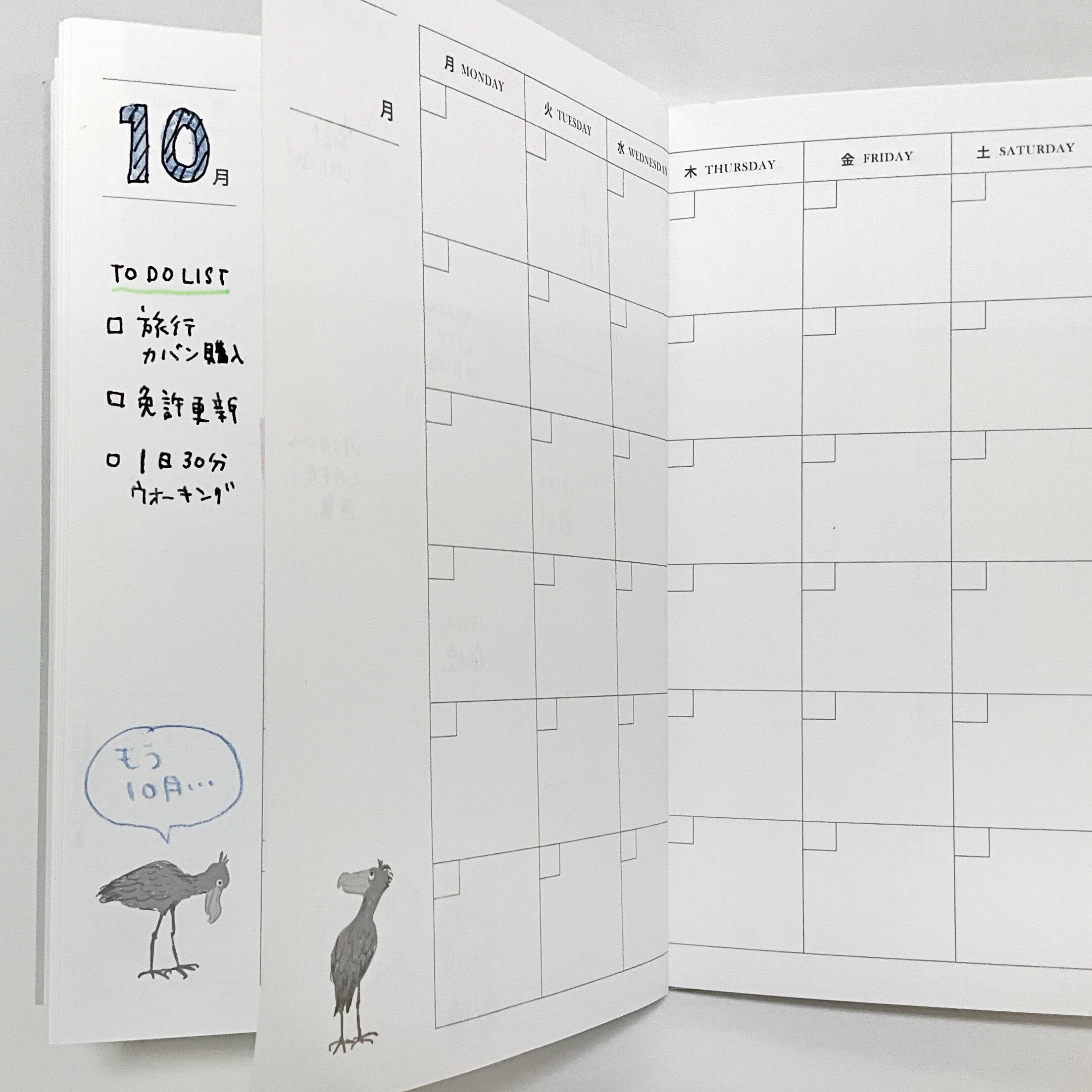 「ハシビロコウNOTE BOOK」フリー月間カレンダー、横罫&方眼ノートです。A6 80ページ。いつも手元にハシビロコウを。 スケジュールサンプルのシールは付いていません。