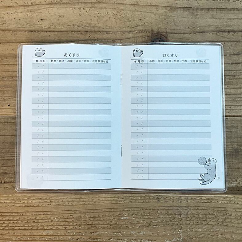 かわいいラッコのおくすり手帳が登場しました! 大きさは一般的なおくすり手帳と同様のA6サイズ、カバーにはカードを差し込める切り込みがあります。コンパクトなデザインで持ち運びも便利。28ページの中には、お薬の種類や服用方法を記録できます。カバーにはカードを差し込める切り込み付きなので、保険証も収納でき、癒されるラッコたちがあなたの健康管理を手助けします。
